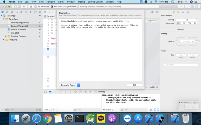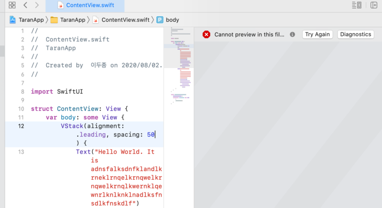 해당 에러는 iOS 개발에 Swift, SwiftUI를 사용하게 됬을 때 발생한다.