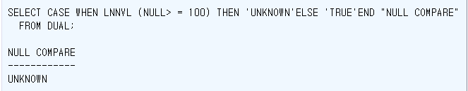 SELECT CASE WHEN LNNVL (NULL> = 100) THEN 'UNKNOWN'ELSE 'TRUE'END "NULL COMPARE"