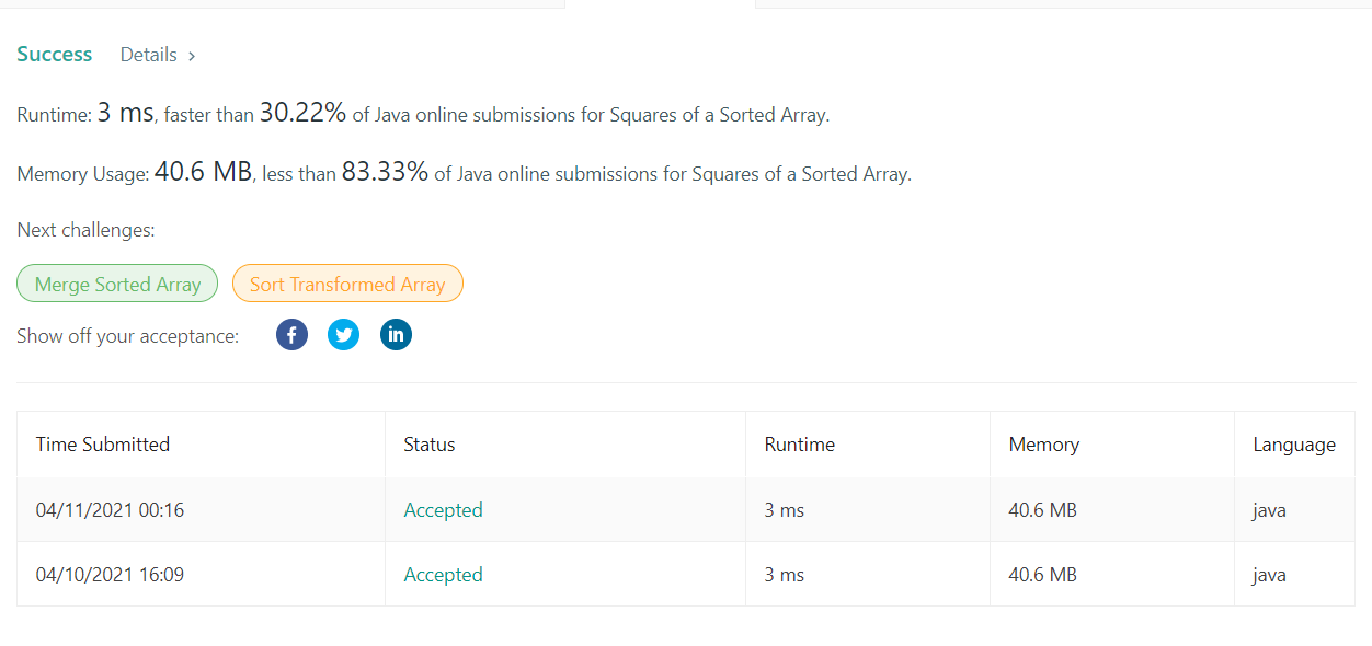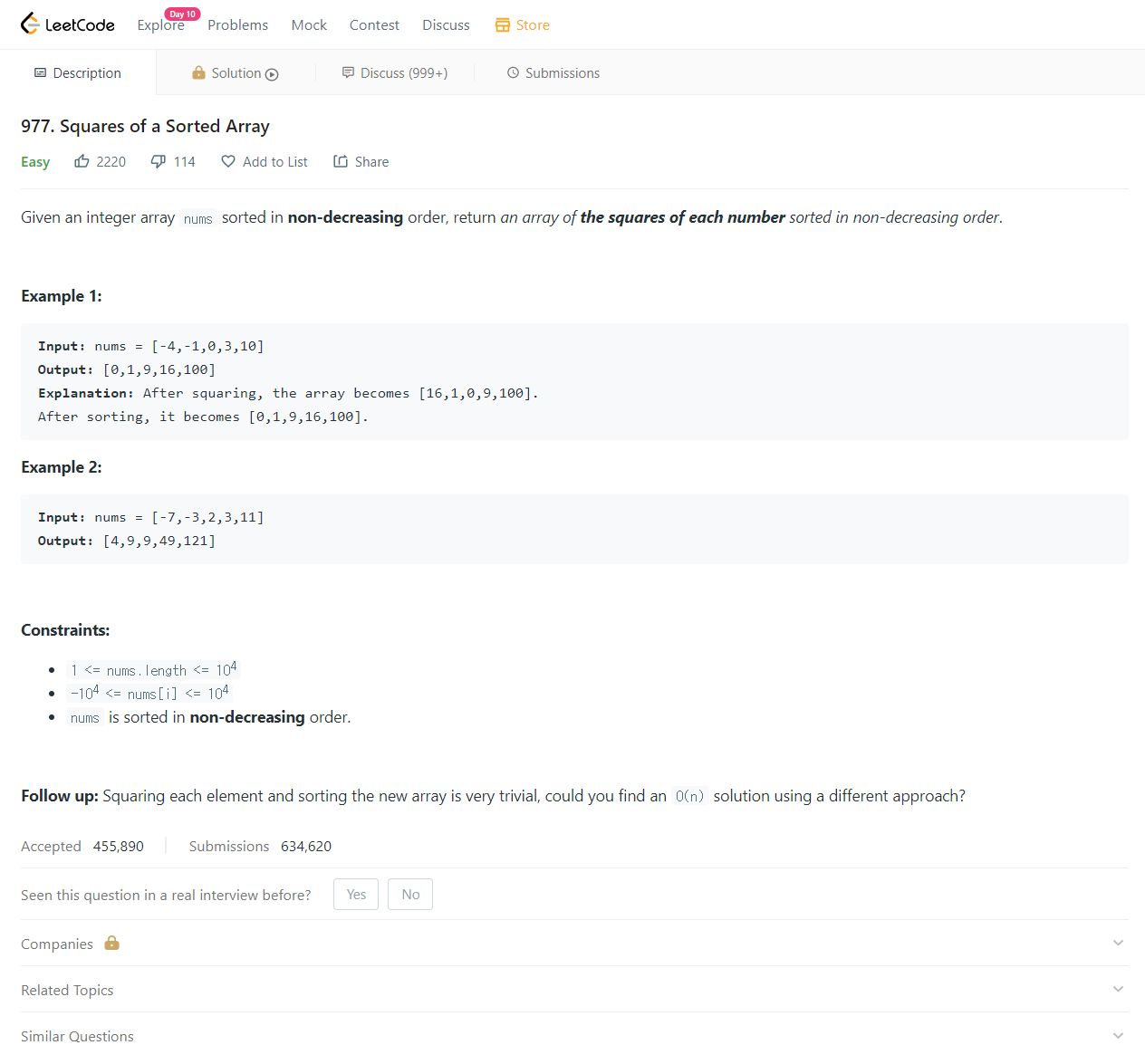 Explanation: After squaring, the array becomes [16,1,0,9,100]. After sorting, it becomes [0,1,9,16,100].