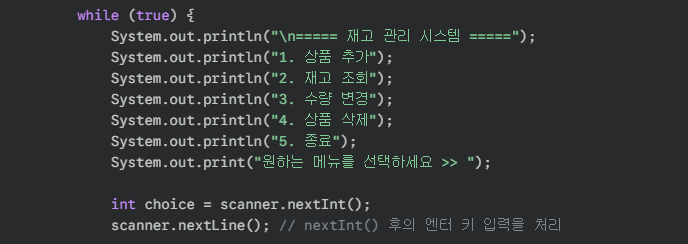 - while(true): 사용자가 '종료'를 선택하기 전까지 계속해서 메뉴를 보여주는 무한 루프입니다.